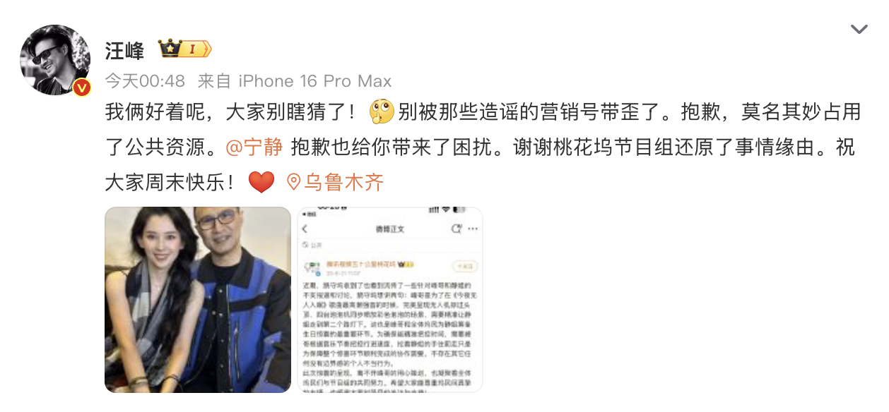 6月22日,汪峰在个人社交账号上辟谣,晒出与女友森林北的合照,并表示:“我俩好着呢!大家别瞎猜了。”并@了宁静向她道歉:“抱歉也给你带来了困扰。”